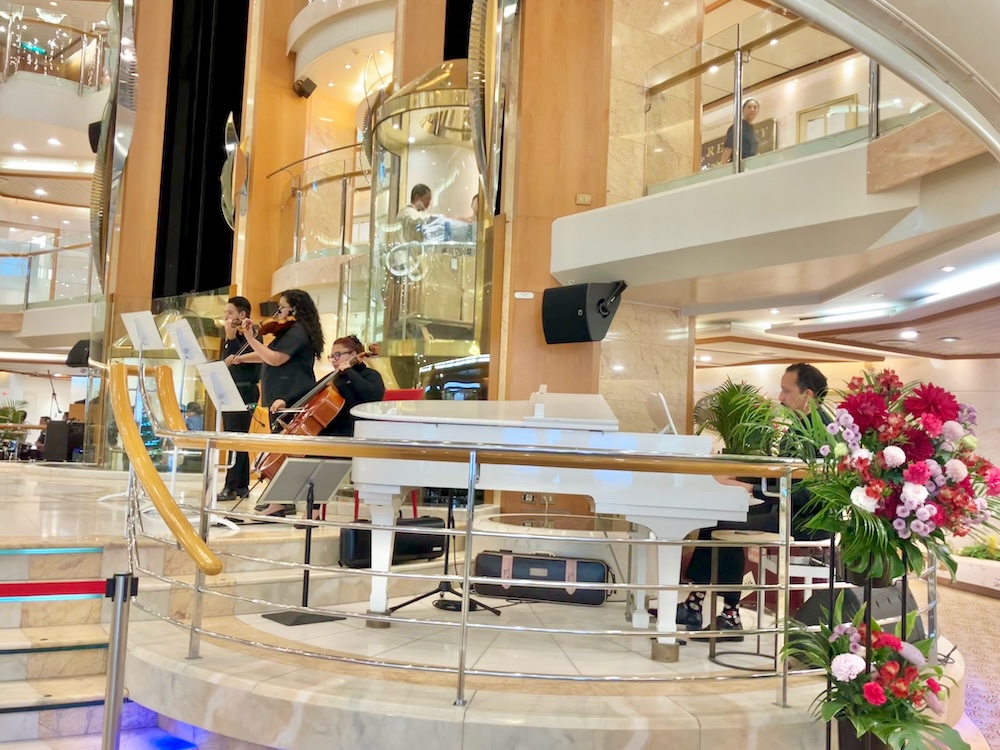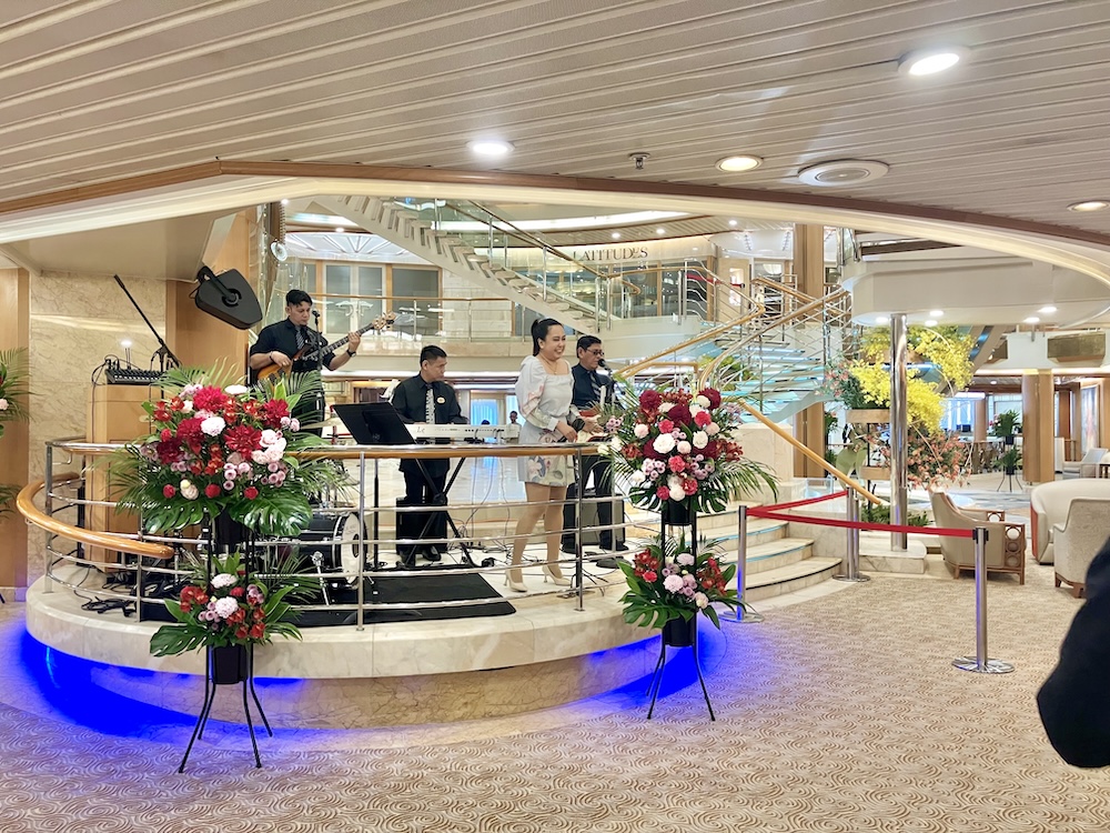 横浜港からは約1000名のお客さまが乗船され、バンド演奏やカルテット、ピアノ、フルートなどの心地よい音楽で皆さんをお迎えします。