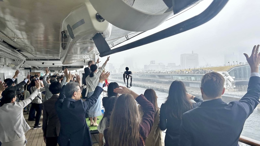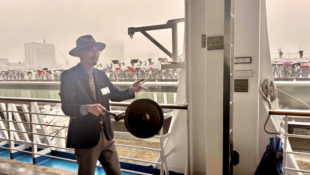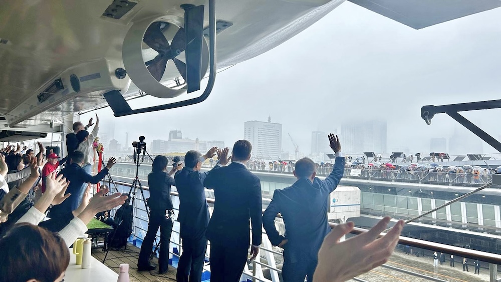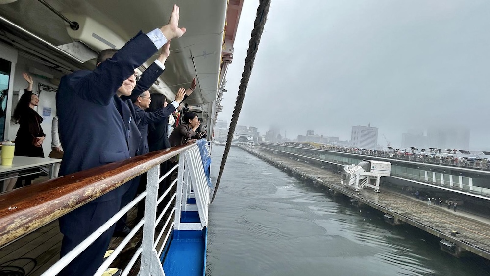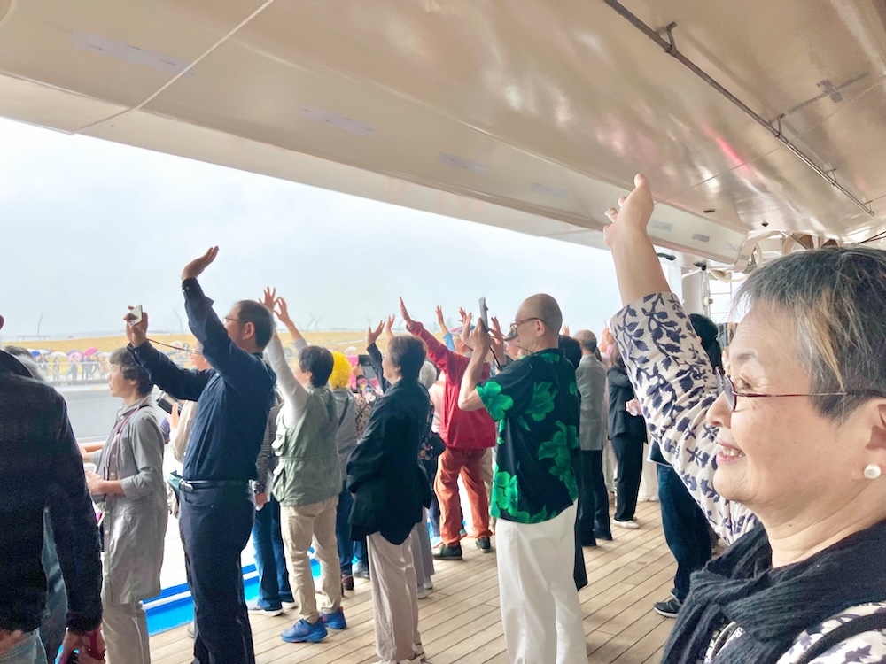 あいにくのお天気ではありましたが、出航セレモニーには、傘を差しながら多くの見送りの方が参加してくださいました。