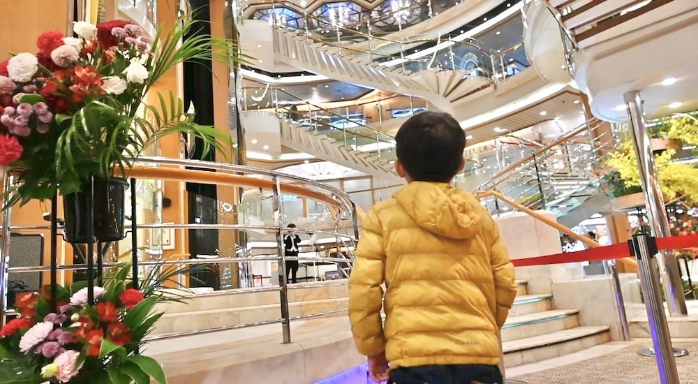 ピースボートを初めて見た子どもたちは、吹き抜けのアトリウムで天井を見上げたり、ガラス張りのエレベーターに笑顔で乗っていったり…思い思いの乗船風景✨