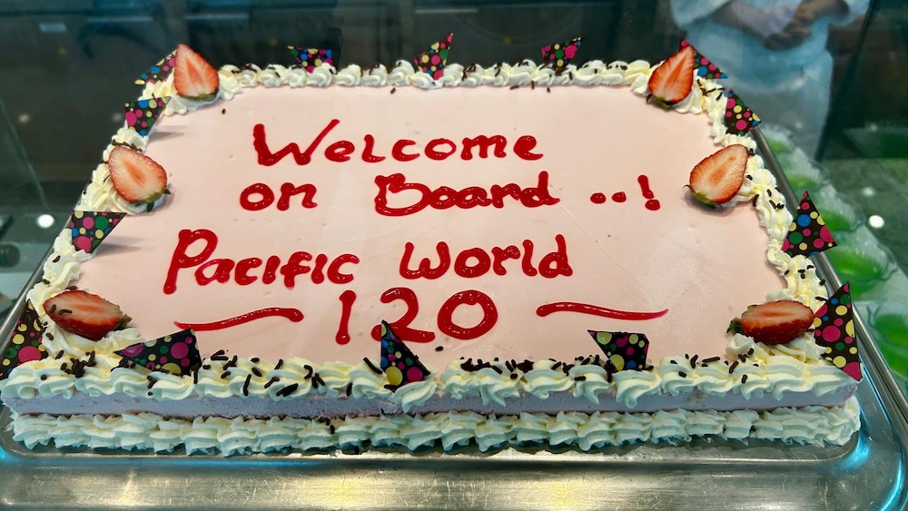 ビュッフェレストランには、“ようこそ!パシフィック・ワールド号 〜120〜”と書かれたケーキも🧁!