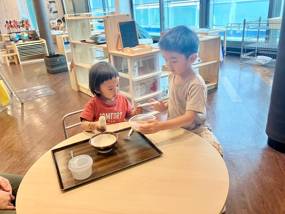 先にふりかけをかけたお友だちは、「お先に」と、声をかけてお隣へ渡すことも☺️