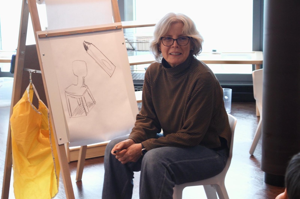 真剣な眼差しで何かを見つめながら、イーゼルに絵を描きます。