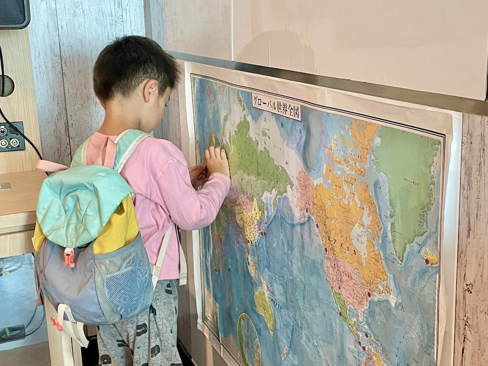 「次は〇〇に行くね」、「もう日本からこんなに離れたね!」など、お話をしながら、私たちの船旅が半分過ぎていることをシールを見ながら確認します。